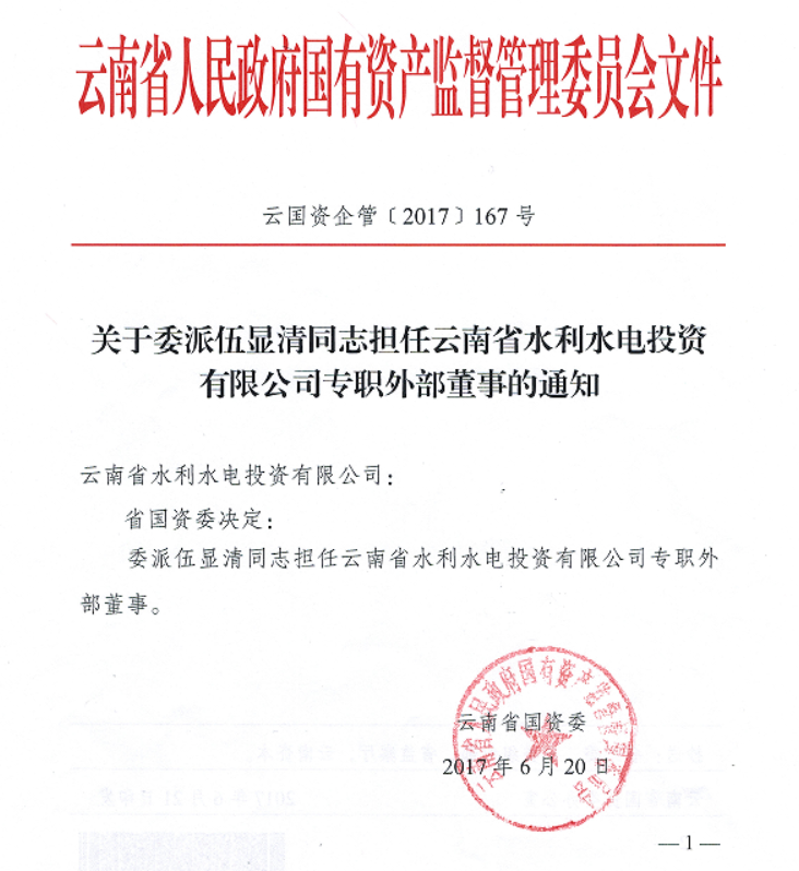 云南省国资委关于委派伍显清同志担任公司专职外部董事的通知
